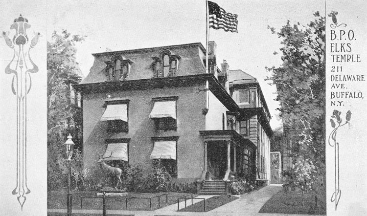 The Buffalo Lodge of the Benevolent and Protective Order of Elks (B.P.O.E.) was chartered in 1884 as number 23. The fraternal organization, operating under the principles of Charity, Justice, Brotherly Love and Fidelity, met in a succession of five locations, including the Buffalo Builders Exchange, before they purchased the former George Starr Hazard mansion at 211 Delaware. The home, built in 1849, had an addition extending from the rear, which the Elks demolished and then constructed a 98 feet long, 44 feet wide structure, attached to the home by a conservatory. The new constuction, with the most modern ventilation and both gas and electric lighting, cost nearly $25,000. By the time the lodge finished renovating the house portion and furnishing the complex, they had spent nearly $100,000 of 1907 dollars ($2.3 million in 2010 dollars). The lodge had at this time 1,000 members.